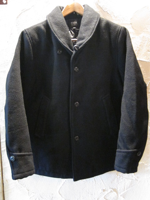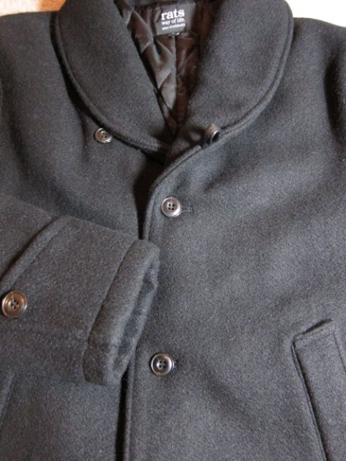 RATS/SHAWL COLLAR COAT BLACK RATSのショールカラーコートです。 両裾部にポケットが付きます。 ボタンは水牛ボタンを使用しています。 糸から織り上げたRATSオリジナルメルトン地を使用しています。 中綿キルティングの為、保温性に優れています。 生地はWOOL90%、NYLON10%メルトン地を使用しています。 × M 着丈67cm身幅53cm肩幅43cm袖丈61cm × L 着丈68cm身幅55cm肩幅45cm袖丈62cm 在庫あり:○ 在庫なし:× RATS/SHAWL COLLAR COAT BLACK 販売価格: 60,280円(税込) 返品特約に関する重要事項 お問い合わせ 他の写真 バックです。 フロントアップです。 フロントアップです。 Facebookコメント 関連商品 RATS/SINGLE P-COAT BLACK 54,780円(税込) RATS/WESTERN BLOUSON GRAY 30,800円(税込)